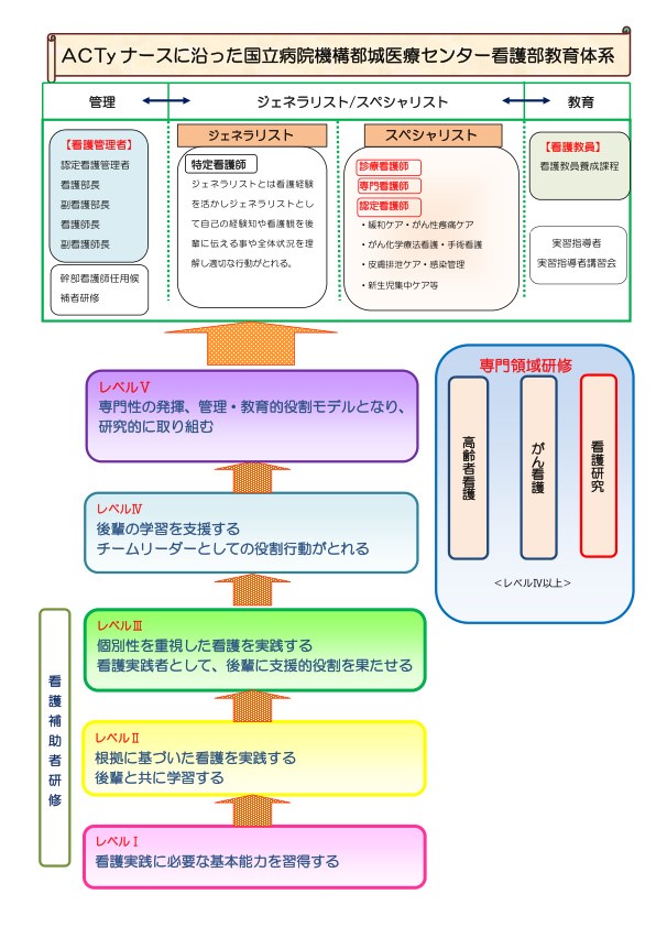 多様化する医療や地域の皆様のニーズに応えるため、看護部では看護職員のキャリア形成を支援する体制を整えています。国立病院機構が示す看護職員能力開発プログラムを基盤に、レベル別教育、専門領域の研修を行い、継続教育を充実させています。